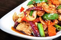 Stir-fried with cashew nuts, chili, onion, carrots and bell pepper.